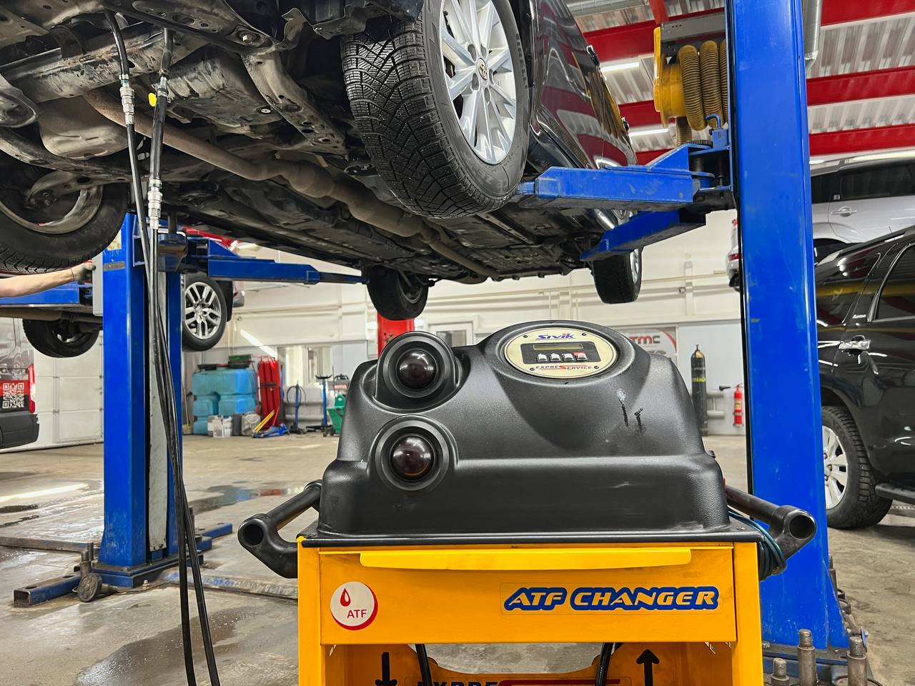 Работы начинаются с компьютерной диагностики. Коробка прогревается до 60-70°C. Аппарат подключается к патрубкам радиатора. Старое масло вытесняется новым. Контроль ведется через прозрачные магистрали.
